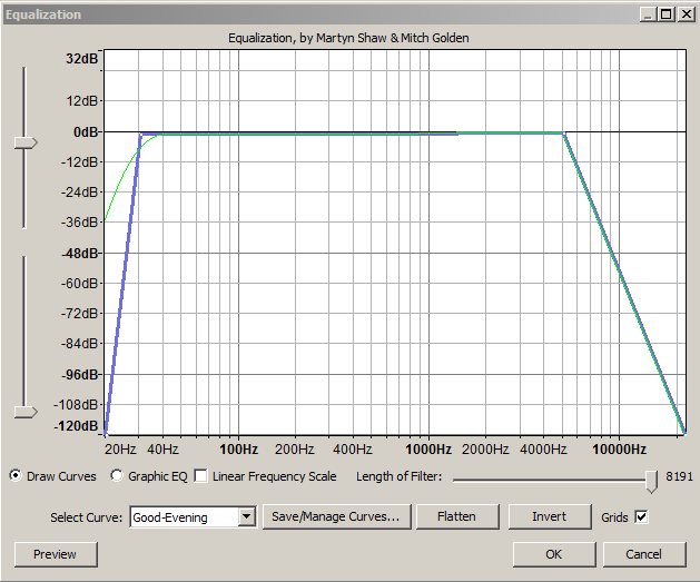 A side-effect of my dehummer is that it attenuates the higher frequencies , (where hiss lives), this is a beneficial side-effect in your case as your tape-recordings only have hiss above 6KHz, no signal (no voice content). Steve’s hum remover doesn’t have that side-effect. However you can cut the hiss after applying Steve’s hum remover by cutting back the higher frequencies with equalization like that shown below …