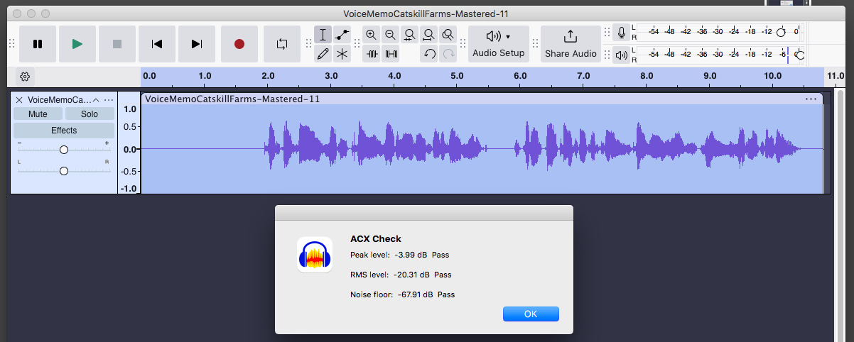 Alright. So then my production my process should include opening the exported mp3 back into audacity, running the mastery and checks on that file, and then having ACX check the file after I re-export it with the compressed and encoded mp3. This is only a problem on files that use more than one track, which I usually do when I need to add audio effects to a specific character’s voice.