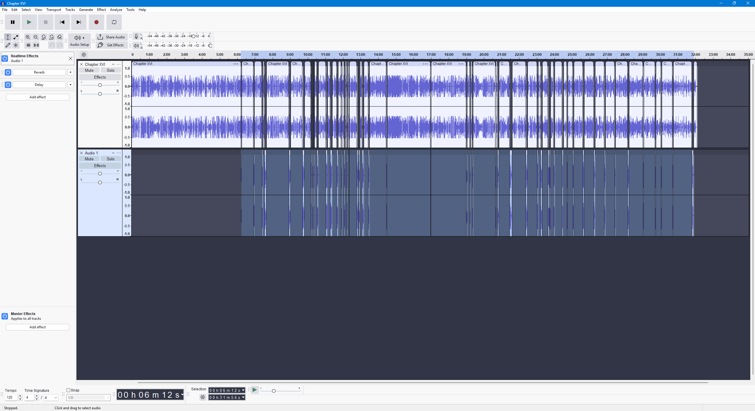 For effects, I’m only wanting an echo effect to differentiate mental speech from a character, from their eventual normal speech. previously I would simply speak quieter and closer to the microphone for the illusion of closeness. I got approval from the author for adding an effect that helps things be more distinct. I’m still finding I need to re-record the character’s lines, but I will export in FLAC or WAV, so that audacity merges tracks, then master it in a new aup3 file, and export as mp3. a pain, but a more thorough method that I may adopt moving forward should I do anything like this again!