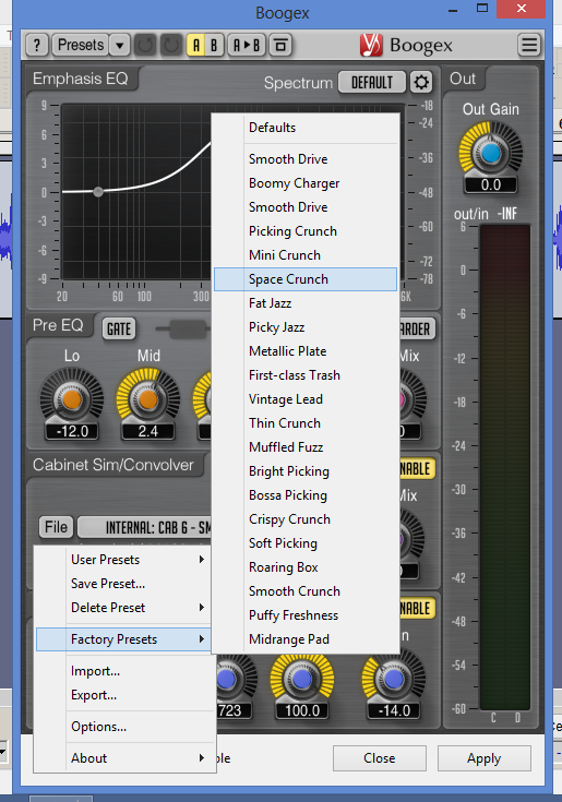 Thanks, guys. I loaded Boogex and it works fine. However I noticed that part of the plugin face is grayed out. The two input areas where the user can load cabinets and/or effects are grayed out and fixed at only one choice. Anyone familiar with the plugin and how to add different speakers and effects to Boogex?