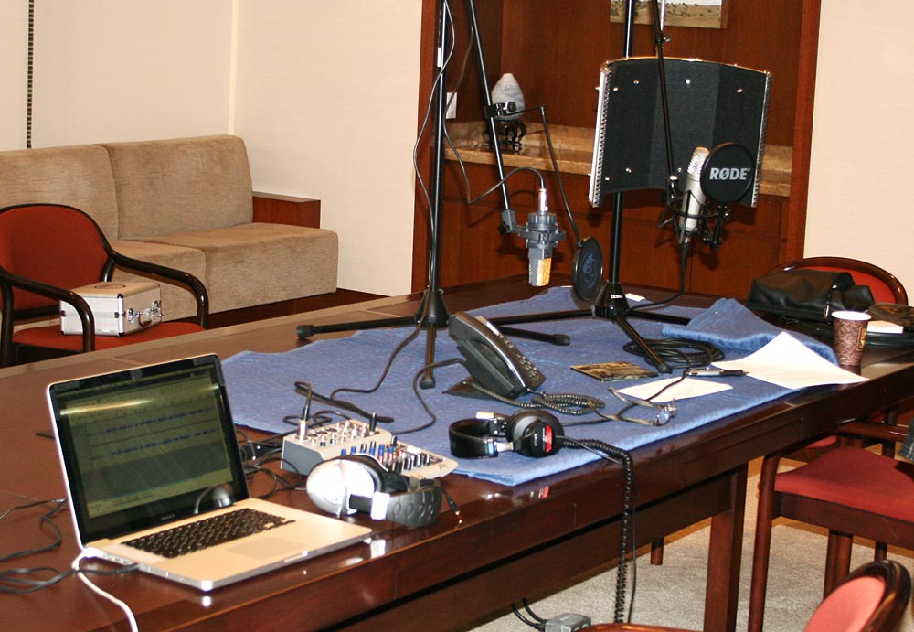 Note in this picture, the table is covered with two layers of moving blanket to suppress reflections/echoes, and the gold microphone on the left (the main one) is a good distance up – on a shock mount – with blast filter.