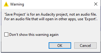 When I usually save my Audacity projects I do the usual, ‘save as’ and then the project is saved as an AUDACITY FILE. Now suddenly when I wanted to save a project I got a little pop up window telling me something I didn’t understand and the Audacity file suddenly was made into a Windows Media file instead of an Audacity file.