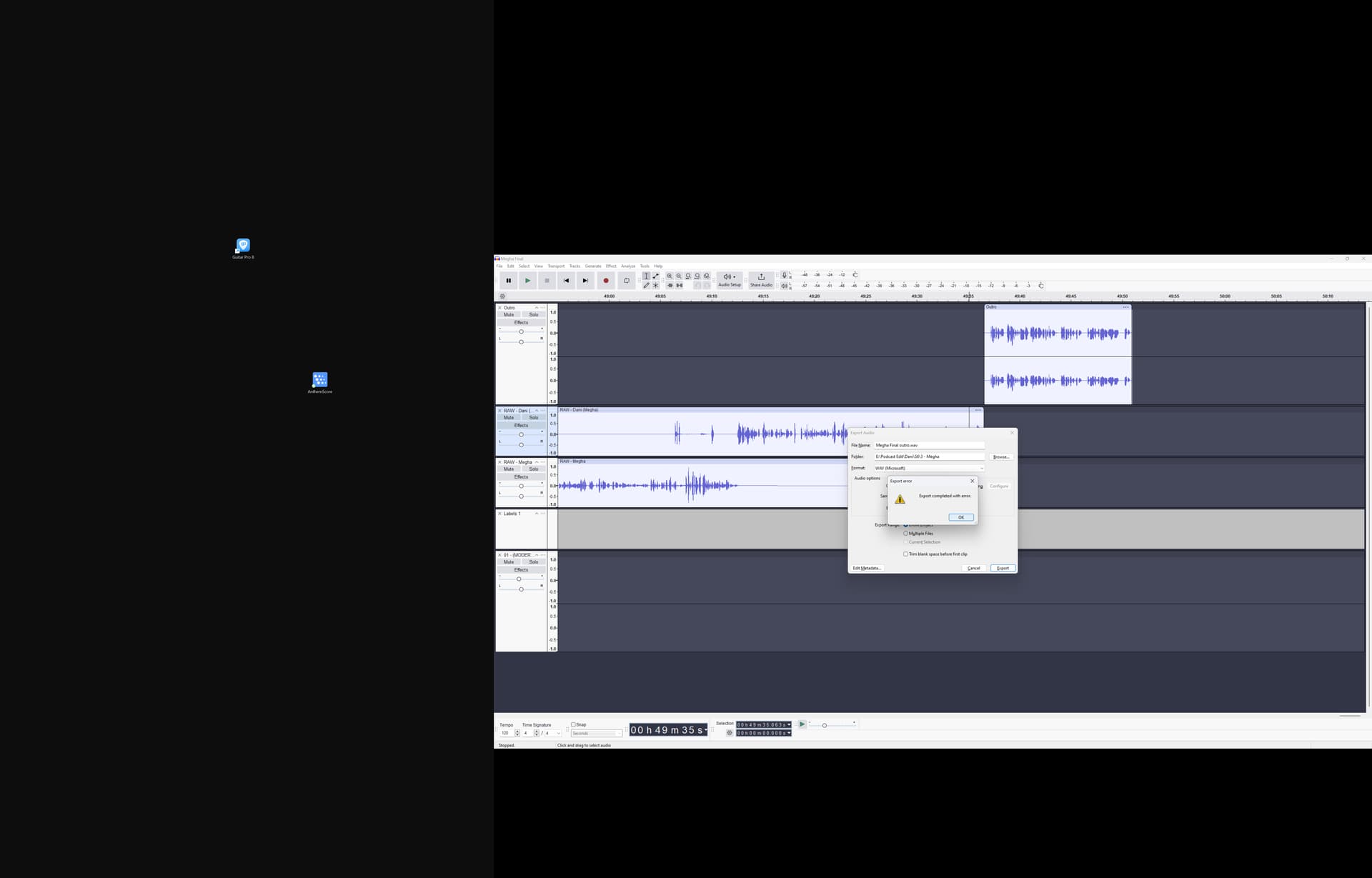 I have absolutely no idea what’s going on and I’m at my wits end. Audacity is now constantly giving me an export error whenever I try to export my project. The catch is literally just yesterday everything was exporting no problem. Now when I try to do it with the exact same export settings in the same destination folder, it’s giving me an error and only exporting the first 17 seconds. I’ve attached pics of what the error looks like. I’ve changed literally nothing so I have no idea why it’s suddenly giving problems