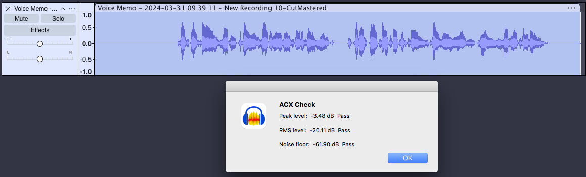 I announced it twice. I cut the first performance and then simple gasp and mouth noise editing. I applied 36Audiobook-Mastering-Macro.txt and then Analyze > ACX-Check.