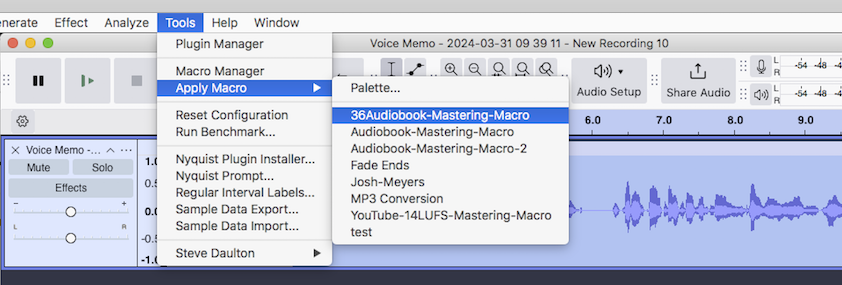 That’s a macro I wrote to set a chapter to conform to ACX audiobook sound standards. If everything goes well, that will eliminate low-pitched rumble in the performance and set Peak and RMS (loudness) perfectly.