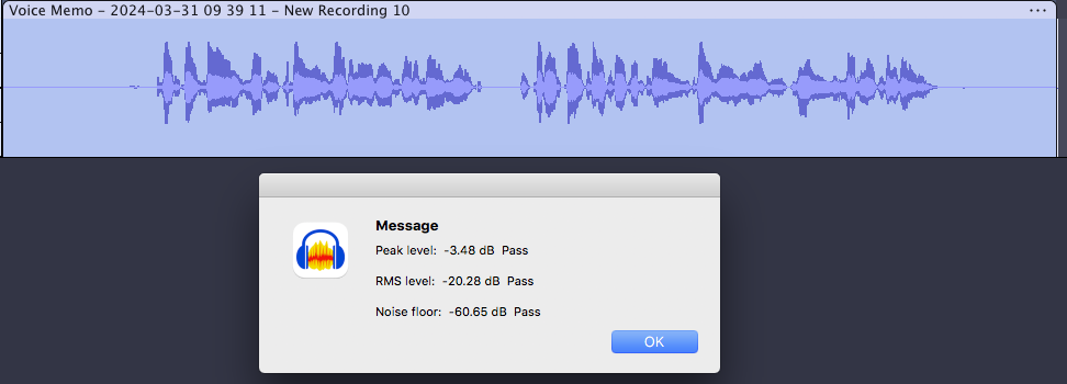 I found the original iPhone performance and sloppy-cut it in Audacity 3.7.1. The noise is closer to failing, but the Peak and RMS (Loudness) are still right on the beans. Peak quieter than -3dB and RMS (Loudness) midway between -18dB and -23dB (-20.5dB)