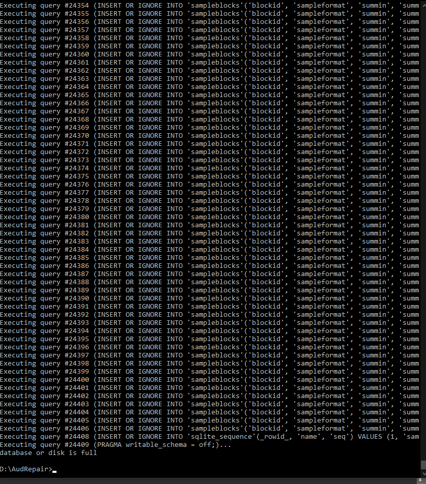 Right now I have a fresh install of 3.7.1, I also tried resinstalling 3.7.0 but the version warning in the cmd still persists. The .aup3 is around 25gb, and the drive I’m working on has around 1tb worth of free space. I just really don’t understand why it’s giving me a message about disk space (or database space).