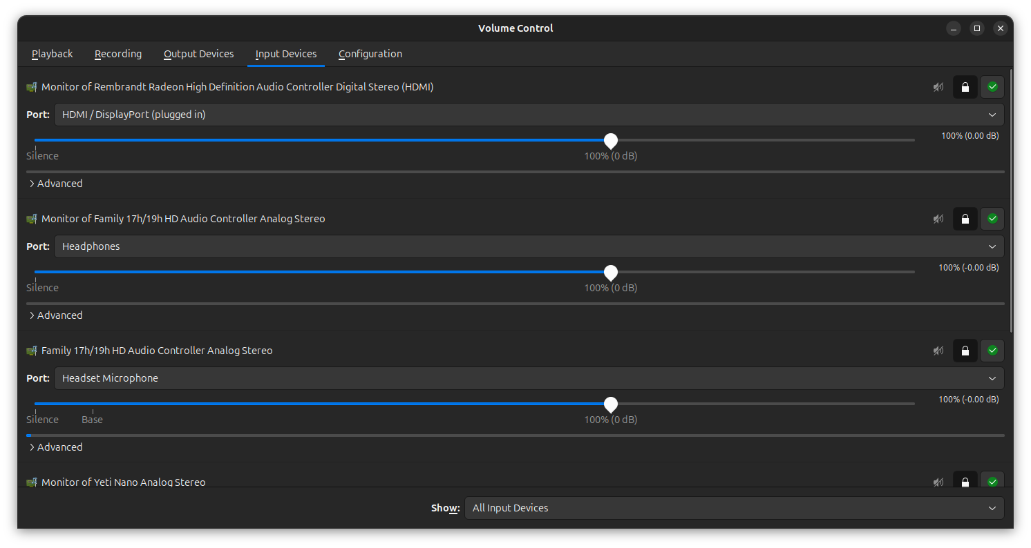 So when I restarted my computer in the morning, the headset I’d plugged into the Yeti Nano didn’t pick up any audio, so I just plugged it directly into my computer again. Here’s what the volume settings look like, and below is the Pavucontrol settings for ‘input devices’.