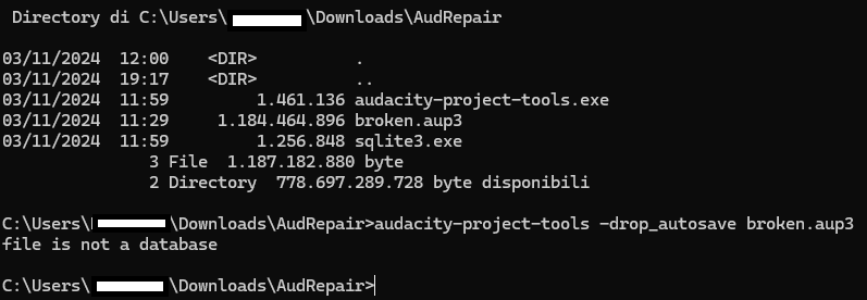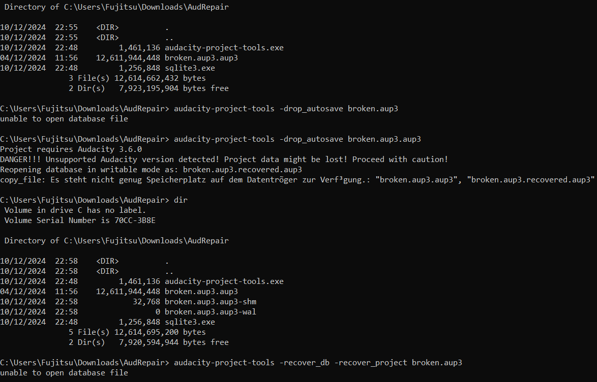 Now my AudRepair dir reads as so: audacity-project-tools.exe, broken.aup3.aup3, broken.aup3.aup3-shm, broken.aup3.aup3-wal and sqlite3.exe