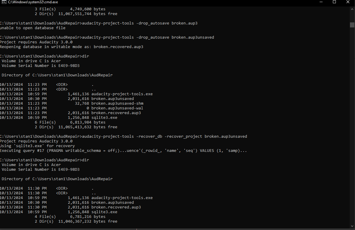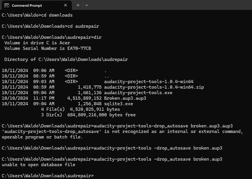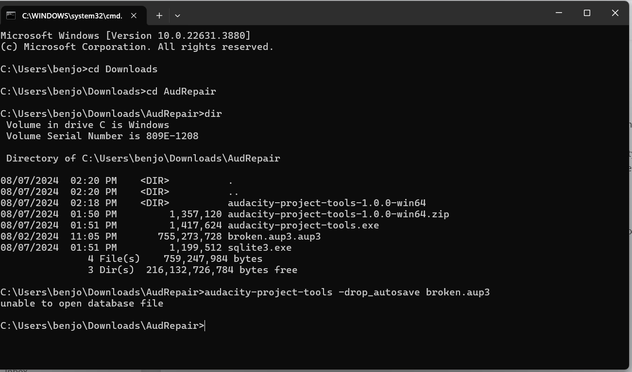 Sorry, I am so late responding to this message. I lost my internet for several days due to a hurricane. As “edit” says, you have named your file “broken.aup3.aup3”. It needs to be “broken.aup3”. One way to fix this is to use the command “ren broken.aup3.aup3 broken.aup3”. Then do your dir.
