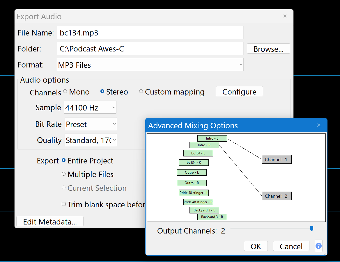 The configure button looked exactly like that. When I delete the .mp3 track and look at the config, it hasnt changed yet it exports properly. I reconfigured the map connecting multiple tracks to L and R channel… didnt change the outcome. What am I missing?