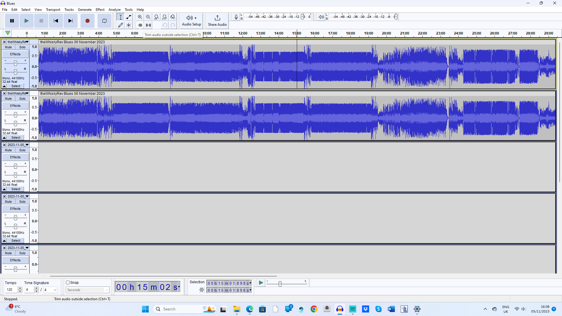 Thank you for your help. This was the file that I exported, and when I imported the saved mp3 of this, it opened as the first picture. The forum would only allow me to attach one photo to the previous post. I seem to have made it work OK by making the two mono tracks into a stereo track. Not sure why they were separated, that’s never happened before but combining them seems to have helped.