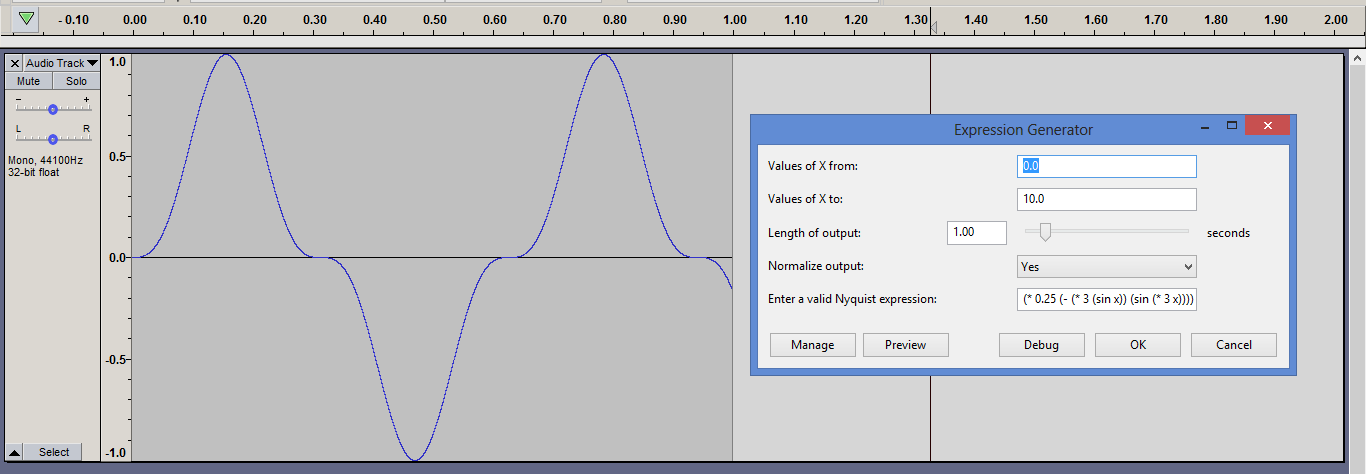 I know, this is a forum, but in case, you’re curious, what I’m doing with this: Try: (/ (+ (expt (- (* 0 x) 1) (floor(* 50 x))) (expt (- (* 0 x) 1) (floor(* -63 x))) (expt (- (* 0 x) 1) (floor(* -75 x)))) 3); Values of X from = -1; Values of X to = 1; Length of output = 0.390625, for example.