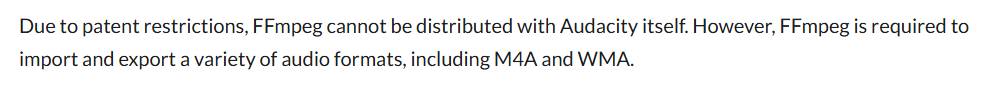Not quite: FFmpeg itself is free and open source, that is to say, the copyright on specific implementation that FFmpeg did is freely licensed (LGPL or GPL). However, patents are a different game: FFmpeg considers itself to not be a computer program, because all they put on their website is code, not binaries. Patents care about functionality: If there’s a patent on “an apparatus to clear snow using a concave surface” (ie: a snow plow), it doesn’t matter that you made your snow plow using open source designs, you’re still violating the patent – unless you use one of those rotary snow brushes. Similarly, any computer program which encode AAC (M4A) isby definition violating the patent, unless they pay about a dollar for each copy of the software they sell. The best solution for users is to use the equivalent of a rotary snow brush, ie a different format.