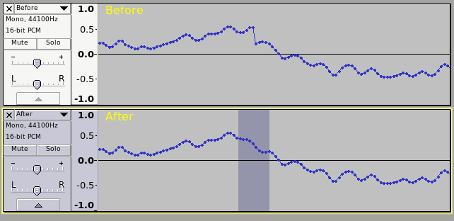 This image shows “before” and “after” a click has been repaired with the “Repair” effect: