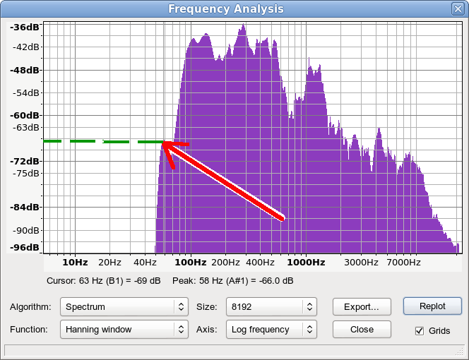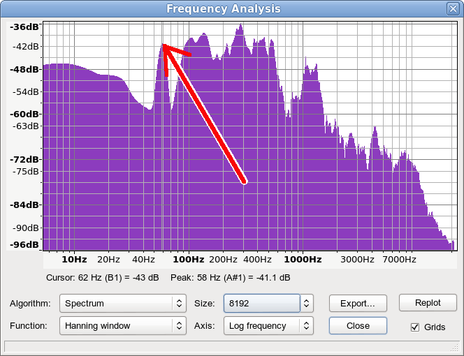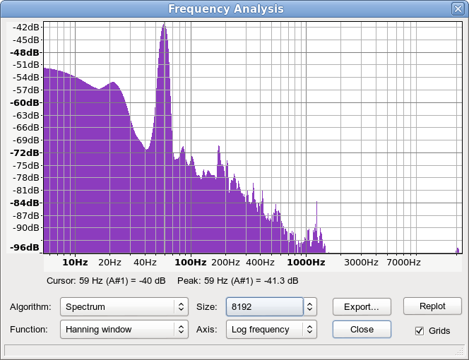 This spectrum plot is from one of your unprocessed (raw) silences. You can see that there is a large spike at 60 Hz (reported as 59 Hz), but thankfully no big spikes beyond that.