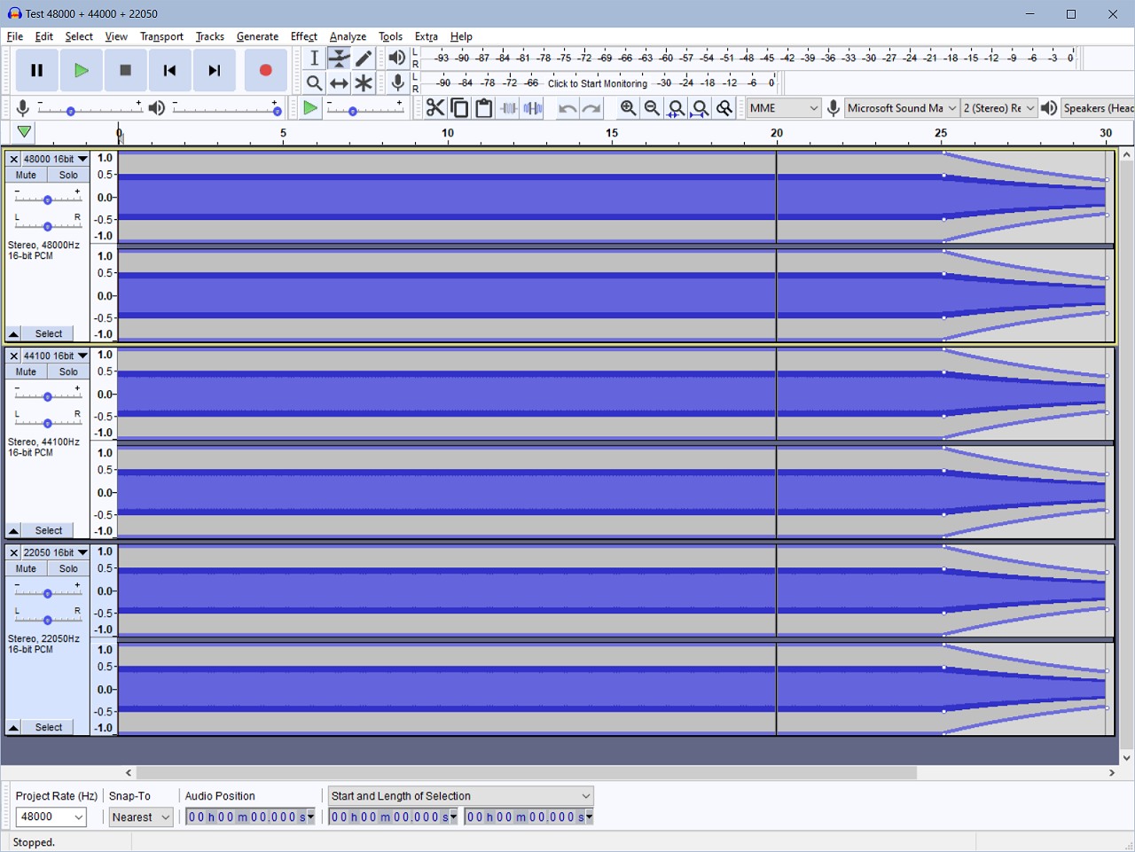 The second picture is just after opening/importing it into v375. The short clips have all shifted left or right, depending on their sample rates (the app’s default settings were 32khz at 32bit for this test). And the envelopes have also shifted, and no longer line up with the clip ends. Also of note, all tracks are 16bit, but the 48khz track is the only one that imported as 32bit. It didn’t matter if the 48khz track was first in the list, or second in the list, it always comes in as 32bit, but the other tracks come in as 16bit. I did an Amplify +9db then an Amplify -3db for all tracks, and only the 48khz track was not clipped from this, so it really is 32bit as it says it is.