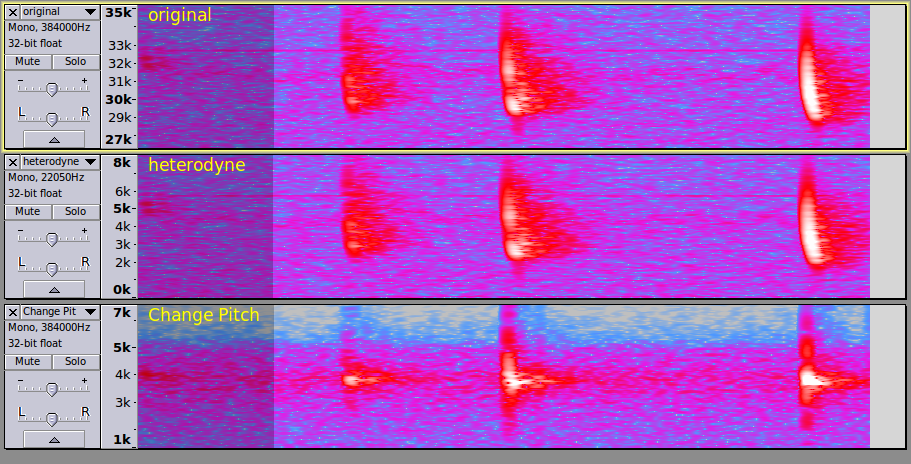 Interestingly. Trebor’s version sounds more like what I’ve heard on TV / Radio, presumably because of the common practice of using heterodyne conversion, but looking at the spectrum (Plot Spectrum) for the original and each type of conversion, the “Change Pitch” method looks a lot more like the original, so could be argued, more like what a bat hears.