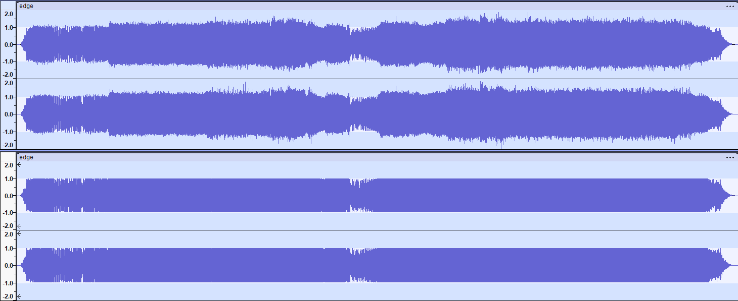 I have some MP3 files that when uploaded into Audacity, they have samples above “1”, however, when using the NAudio package in a C# project to read and then re-write the file to a wave file, it clips all samples above “1”. Here is an example of each result: (correct unclipped version above, NAudio processed version below)
