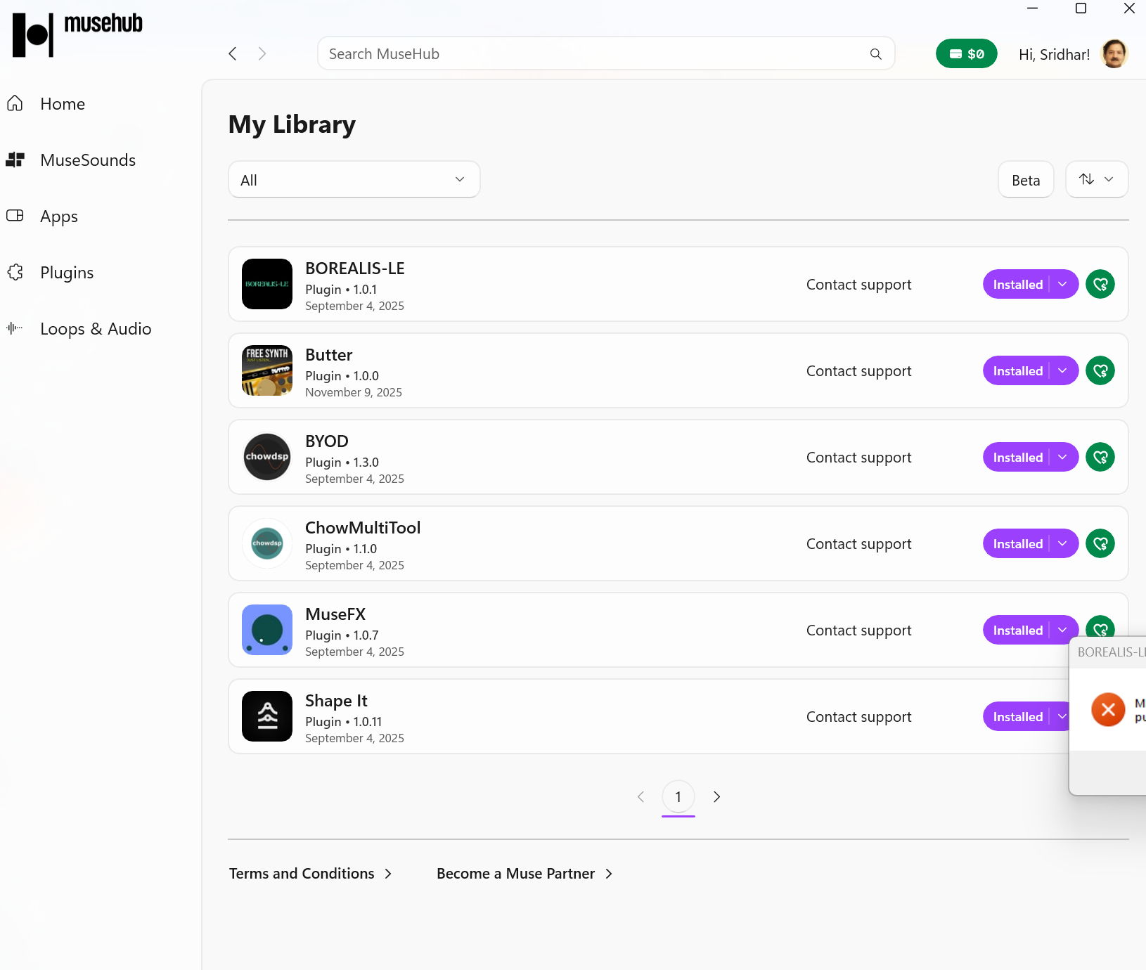 I logged into Muse Hub - assuming it will make a difference – though I still do not know how to authorize/authenticate the Plugins I had downloaded and use some of them.