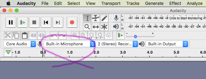 If the sound input meter in System Preferences / Sound / Input does not move when have selected the USB PnP Audio Deviceand you are playing a cassette in the Wikoo, then the Mac is not receiving sound from the device. If the Mac is not receiving sound from the device then Audacity won’t.