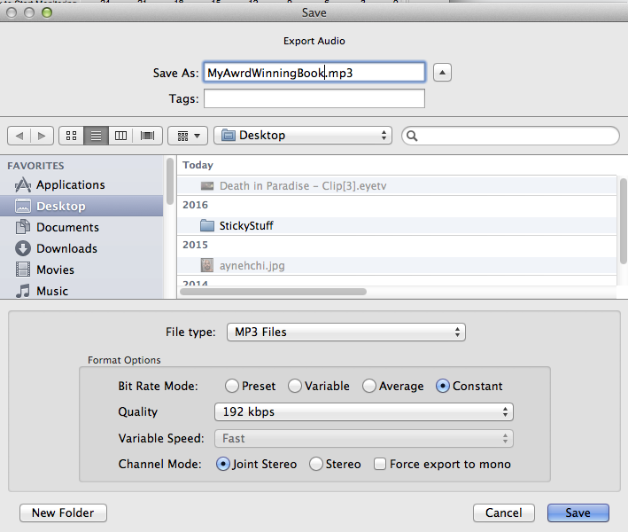 When you get an edited chapter you’re happy with, File > Export > Export WAV and make a perfect quality WAV of the work. That’s your edit master and it’s used if you have to make changes or repurpose the reading for a different venue. Do Not use the lesser quality MP3 for that.