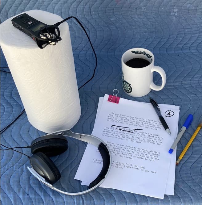 This is my Zoom H1 recorder set up for full studio configuration. Note the furniture moving pad on the desk and I’m recording in my quiet bedroom.