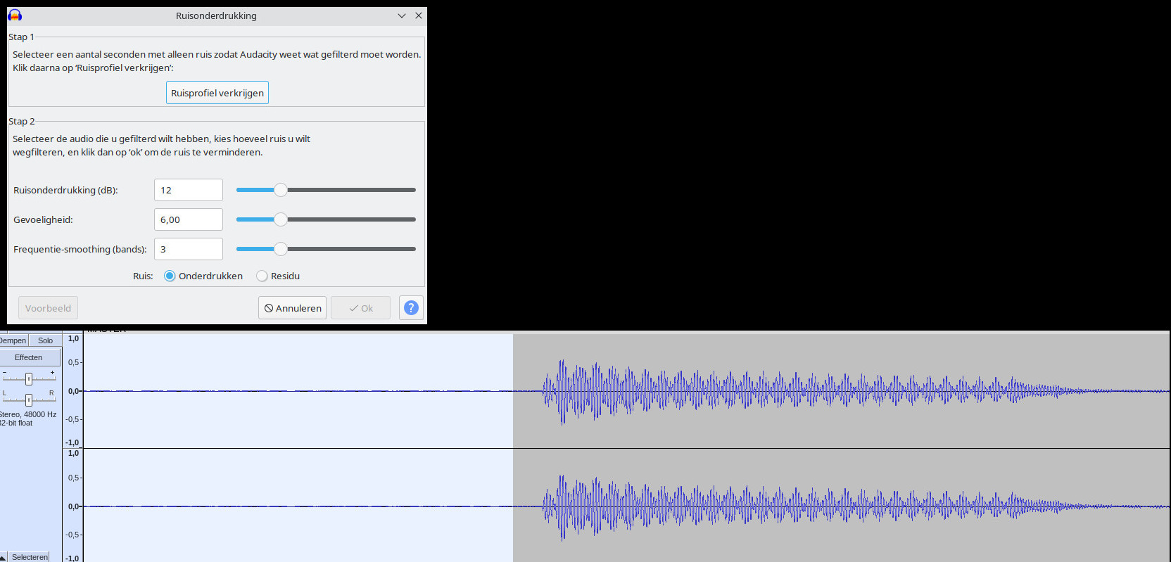 When I have selected the noise, clicked “Get noise profile” and then select the whole file and click “Ok” (my workflow in 2.4.2), the waveform of the noise doesn’t change: