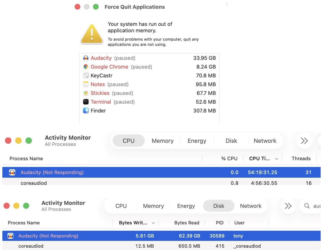 I thought I’d try OpenVino to separate voice from background music in a 2hour audo. It said it was going to take 7.5 hours but didn’t make it because it ran out of application memory. Here are screenshots of the warning dialog plus Application Monitor.