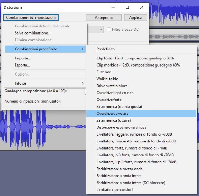 If I access to Effect > Distortion and Modulation > Distortion… and click “presets & settings” button and select a pedefined preset, it doesn’t load and none of the values in the Distortion window change, like so: