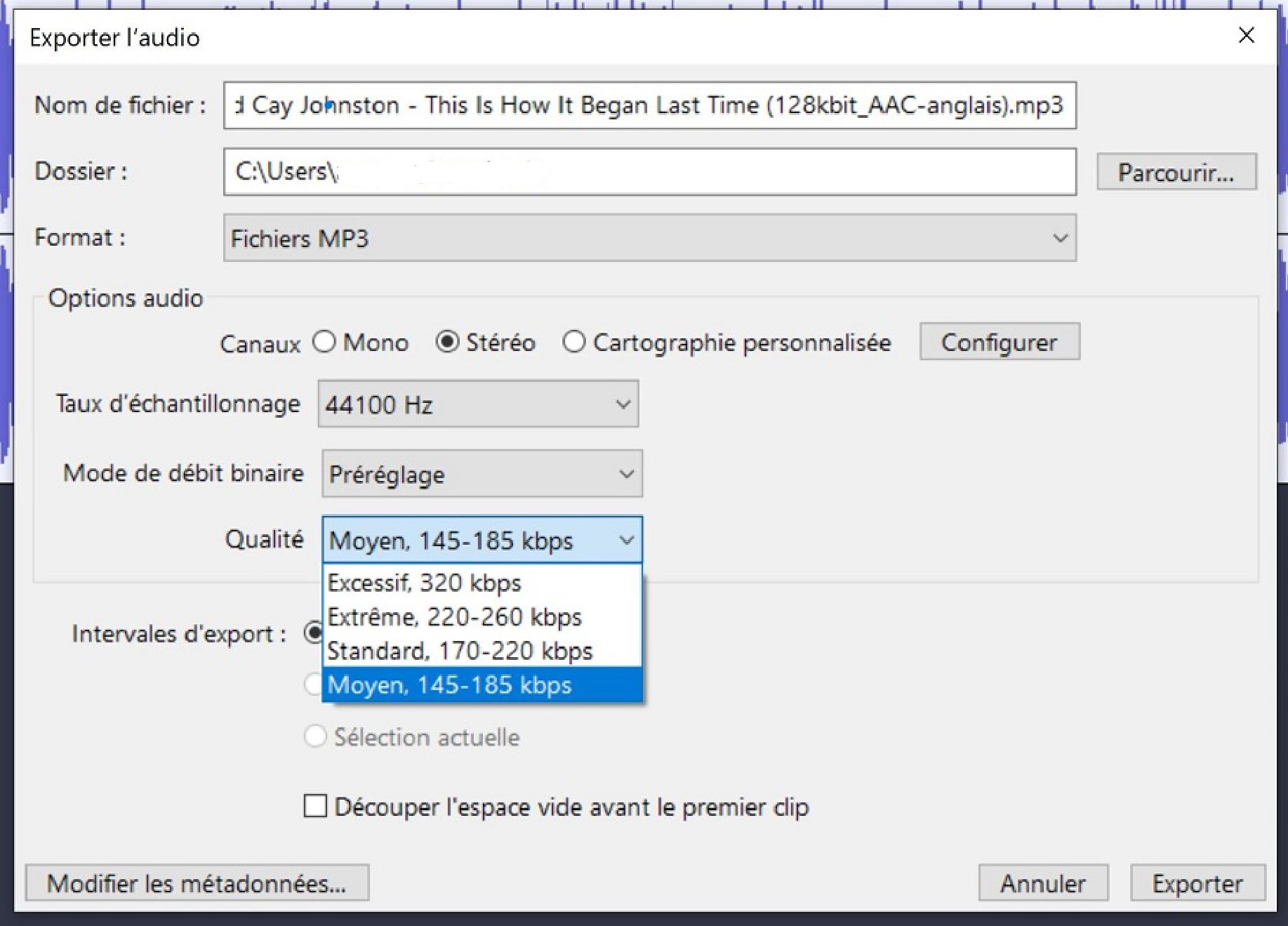 Bonjour, à chaque nouvelle version le choix de la qualité d’encodage des exportations mp3 se réduit. A une époque bénie on avait le choix entre 320kbps et 25kbps si je me souviens bien. J’avais l’habitude d’exporter des mp3 avec uniquement de la voix parlée et obtenais des fichiers audible à 76kbps ou 80kbps et donc des fichiers assez légers. Avec la dernière version il n’y a quasiment plus de gain de poids entre un m4a et son export en mp3 “145-185kbps”. j’aimerai bien retrouver ce choix dans une prochaine version