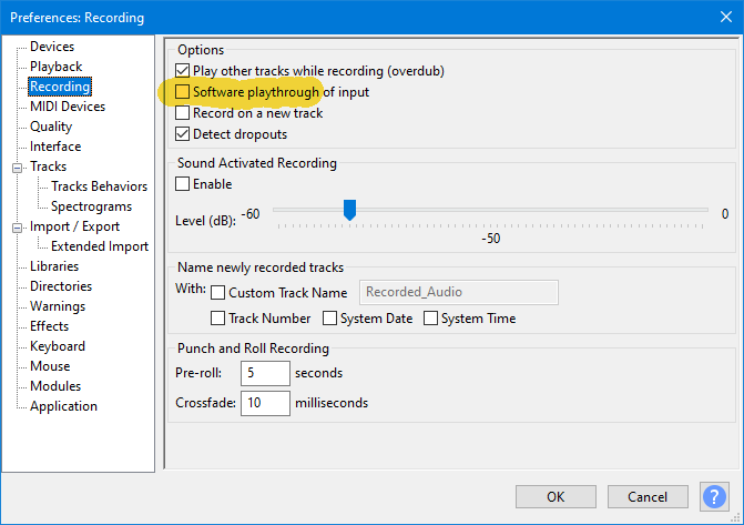 need to ensure something called “software play-through” in Audacity preferences is not ticked,