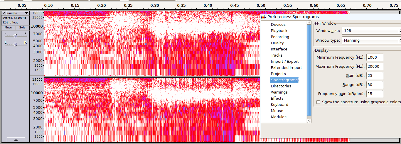 Here is the sample with a screenshot of the graphic with 2 different spectogram view settings.