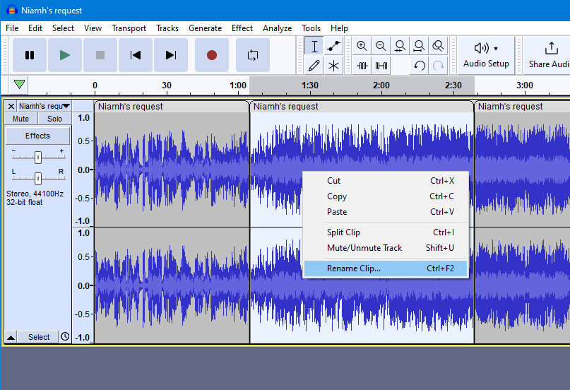2. Right- click in the waveform of the clip to get its context menu