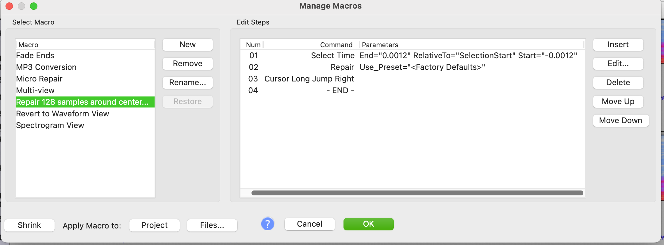 I’m running Audacity 2.4.2 on Sonoma 14.2.1 (MacBook Air). Suddenly I’m getting complaints from Audacity when I try to either manually run the Repair tool from the menu, or a macro which automatically is supposed to select up to 128 samples before and after the cursor.