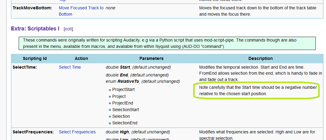 The manual is a little unclear/opaque on that on the Scripting Reference page (which is where I went for guidance on the Select Time command): https://manual.audacityteam.org/man/scripting_reference.html