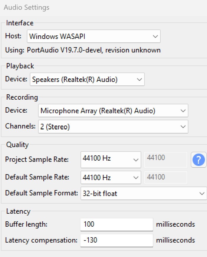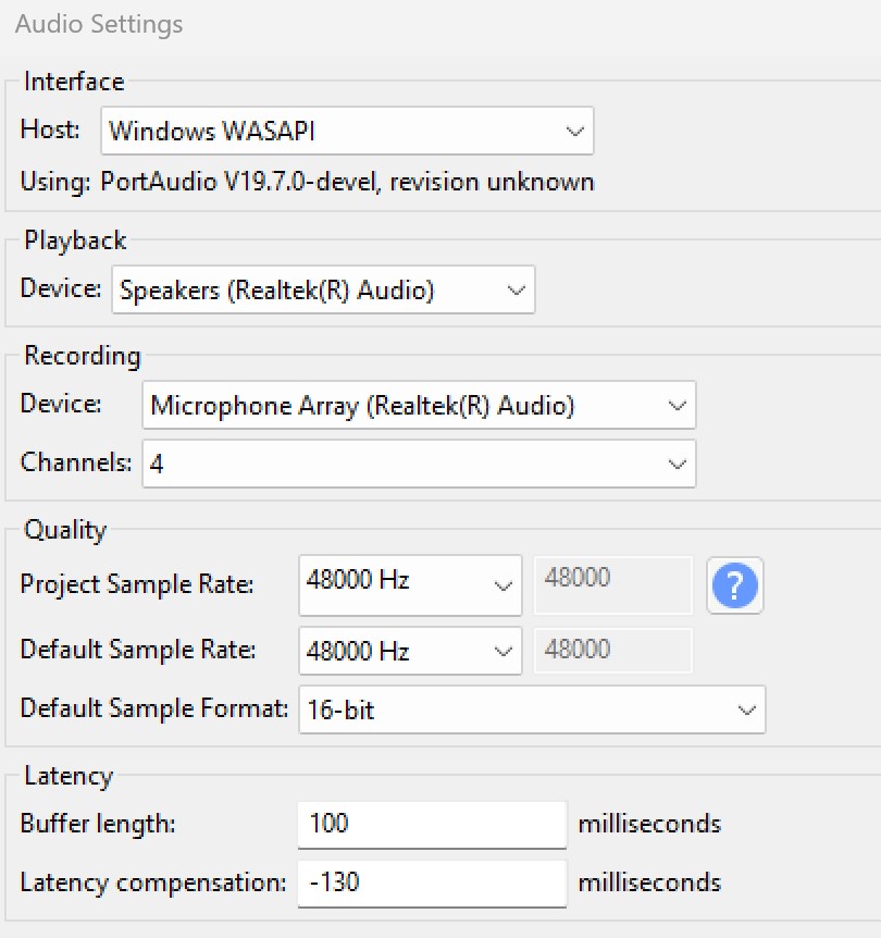 I am having problems recording using my inbuild pc microphone array. The inbuilt Sound Recorder functions OK which suggest that the Settings I have on Audacity are incorrect.
