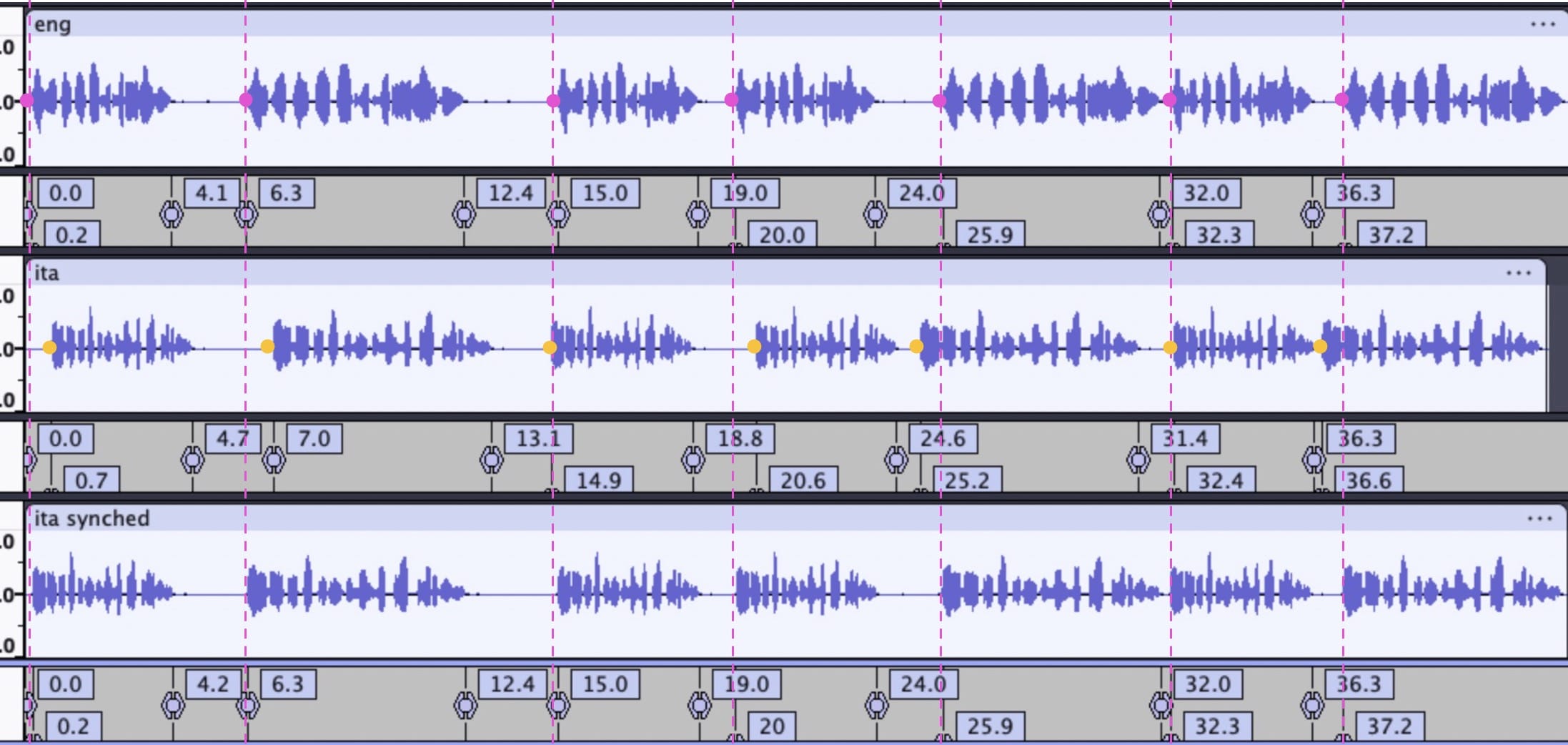 My image below shows a specific example for 2 short audio clips (eng.mp3 and ita.mp3), but what I’m after is something that can be done automatically for much larger audio tracks. This kind of syncing is especially useful for language learning.