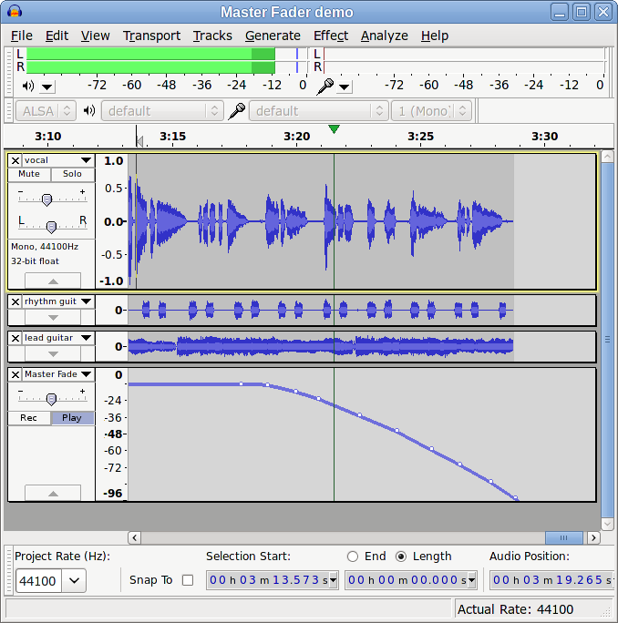 When the “Play” button is pressed, the Master Track envelope will cause the Master Track gain slider (and corresponding Mixer Board slider) to follow the envelope, which in turn will adjust all audio track sliders by the same amount (relative to their current setting).
