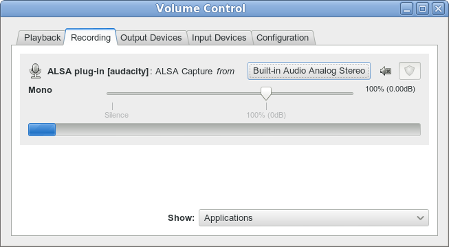 All that was as you described it,except pavucontrol came up with stereo as opposed to mono for Audacity. The moving blue line was flat as opposed to the wave form, whether without or with something streaming. The device shown is my Diamond card (C-Media CMI8738 Analog Stereo) where yours is showing Built In…