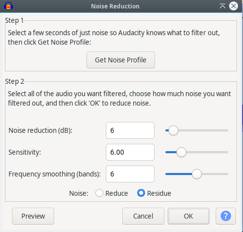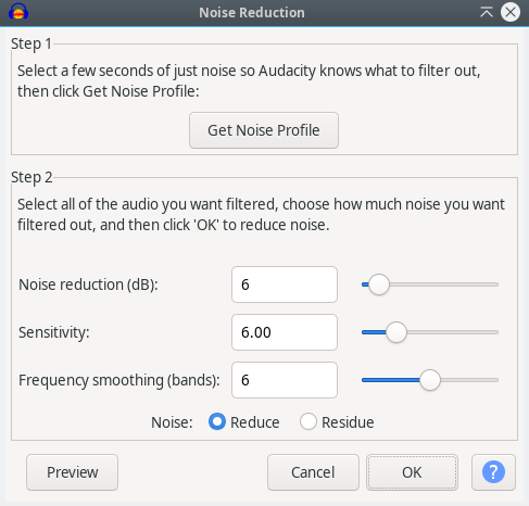 In Audacity 3.7.3, the Noise Reduction effect has these controls —