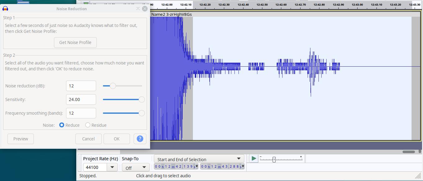 Step 1 Select a few seconds of just noise so Audacity knows what to filter out, then click Get Noise Profile: Get Noise Profile