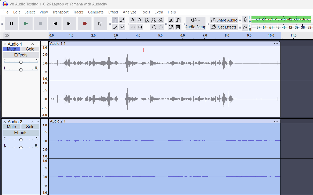 T2: Wasapi/Steinberg,Yamaha mg10xu mic @ -06 - 0. Speaker is still Laptop’s. Why is the waveform so much smaller? In order for me to get the same level of playback, I need to increase aud’s slider on the left to +8. If the mixer is outputting a strong signal to Windows, the property sheet says 0.0db, why does aud see it as so low.