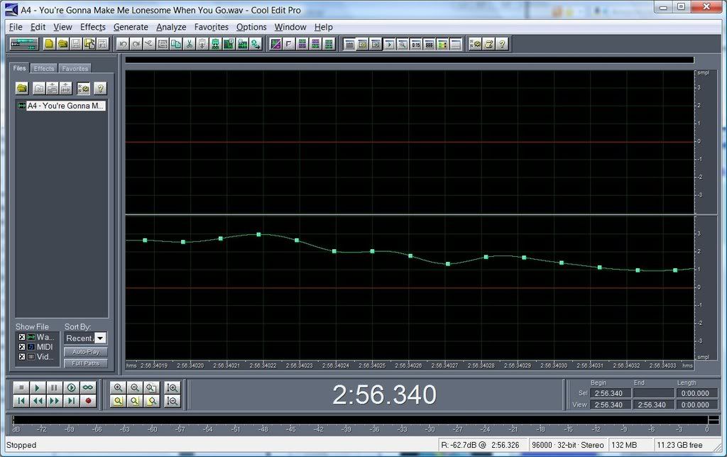 Here's an example that clearly shows samples that are not 16 bit values (vertical scale in dB):eharmonica wrote:When I record in Audacity at 32bit float or 24bit, a close examination of the wav-form shows it to be 16bits padded to 24bit. How do I (we) know? We use Cool Edit Pro to zoom in each sample, then zoom in on the vertical axis to get to single digits on that axis. According to Mitiok, the vertical axis shows 16bit values regardless of the wav rate. Therefore, anything that is 16bit, will have samples fall exactly on each value of the vertical axis. If the wav is 24bit, there will be samples that fall in-between the vertical axis values.